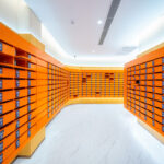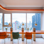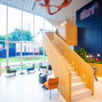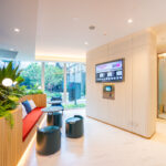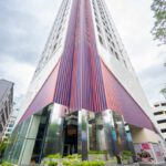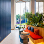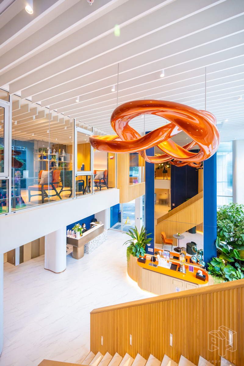 The Ascott Lounge พื้นที่รับรองและล็อบบี้ มาพร้อมดีไซน์ที่ผสมผสานความยั่งยืนลงไป ด้วยต้นไม้และวัสดุปิดผิวเป็นระแนงลอนเหลี่ยมแนวตั้ง เพิ่มความโดดเด่นด้วยบันไดวนเชื่อมไปยังชั้น 1M และโคมไฟสีทองแดงดูสะดุดตา
