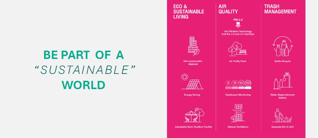 โครงการถูกออกแบบเพื่อสร้างสังคมแบบยั่งยืนภายใต้สิ่งแวดล้อมที่ดีในระยะยาว ด้วยการส่งเสริมแนวคิด Sustainable Living เช่น เลือกใช้วัสดุที่ยั่งยืน ลดการใช้พลังงาน มีจุดรีไซเคิลขวดน้ำดื่ม, จุดบริการเติมน้ำ และมีถังแยกขยะในแต่ละยูนิต