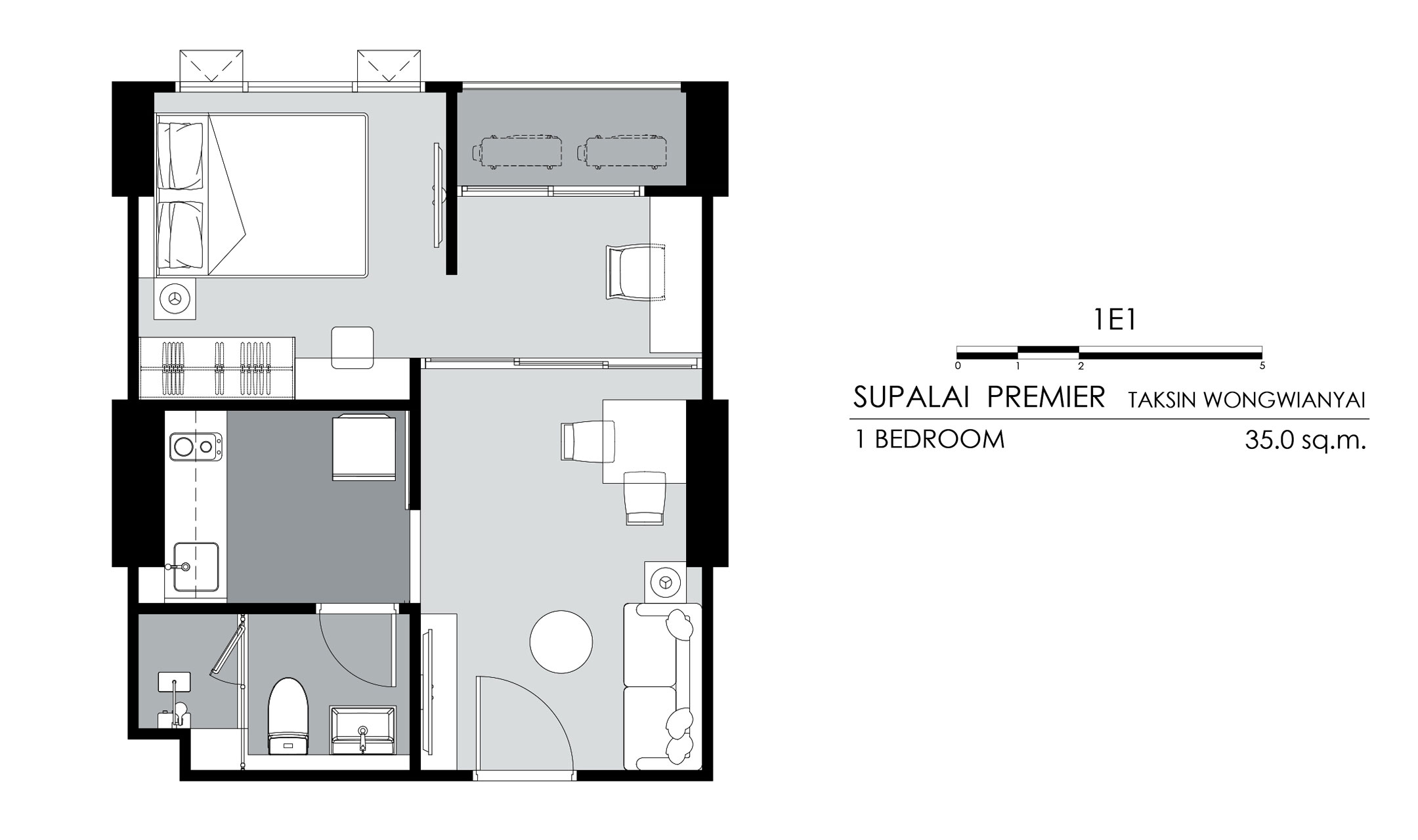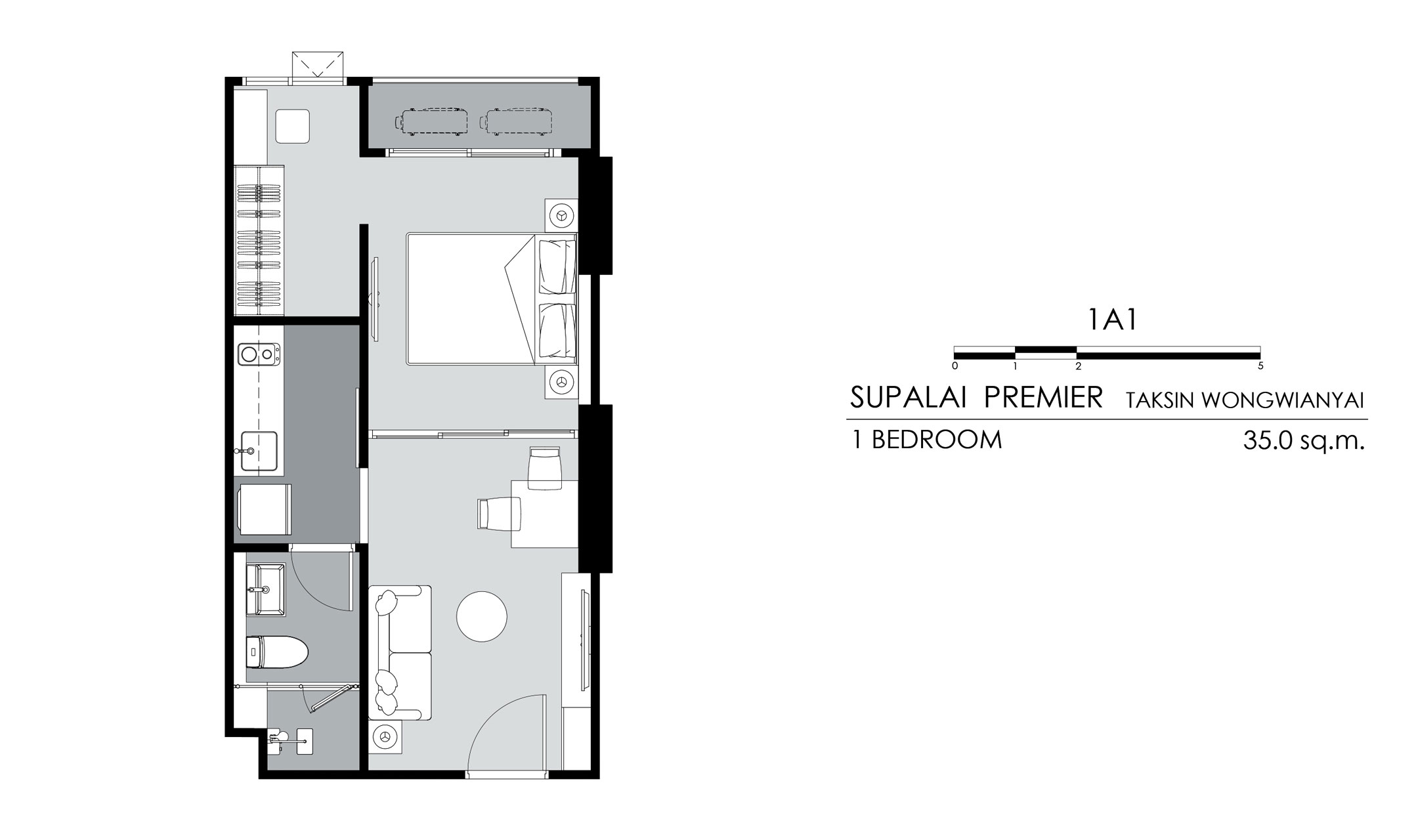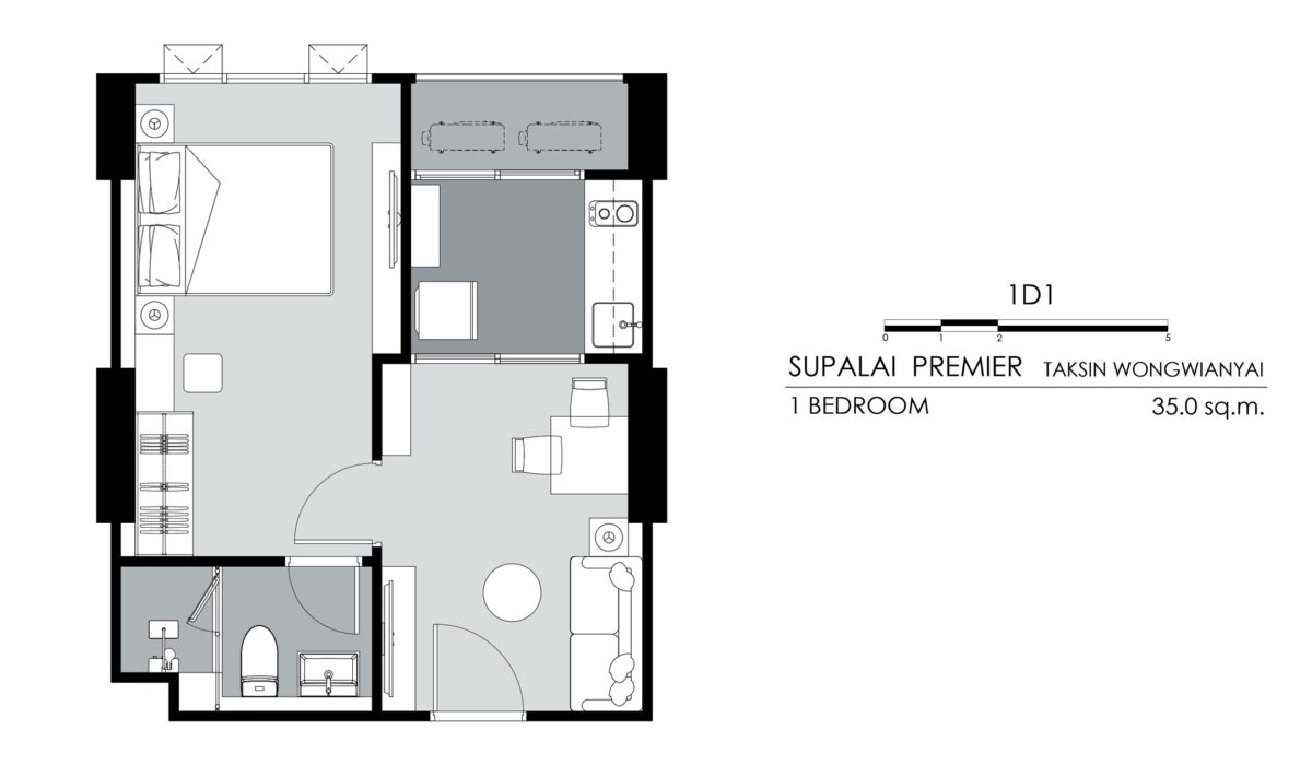 ห้อง 1 Bedroom ขนาด 35 ตารางเมตร แบบ 1 ห้องนอน 1 ห้องน้ำ พื้นที่ของห้องนั่งเล่นสามารถนั่งพักผ่อนได้ทั้งวัน ห้องนอนขนาดใหญ่ จัดพื้นที่โซนแต่งตัวได้ชัดเจน แบ่งสัดส่วนห้องเล็กเพิ่มเพื่อให้ใช้สอยได้หลากหลาย ยืดหยุ่น เปิดประตูรับลมจากระเบียงทำห้องไม่ร้อนตลอดทั้งวัน เหมาะกับคนชอบอยู่ห้องเป็นส่วนใหญ่และไม่เน้นทำครัวหนัก