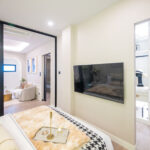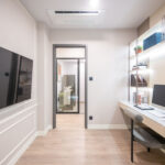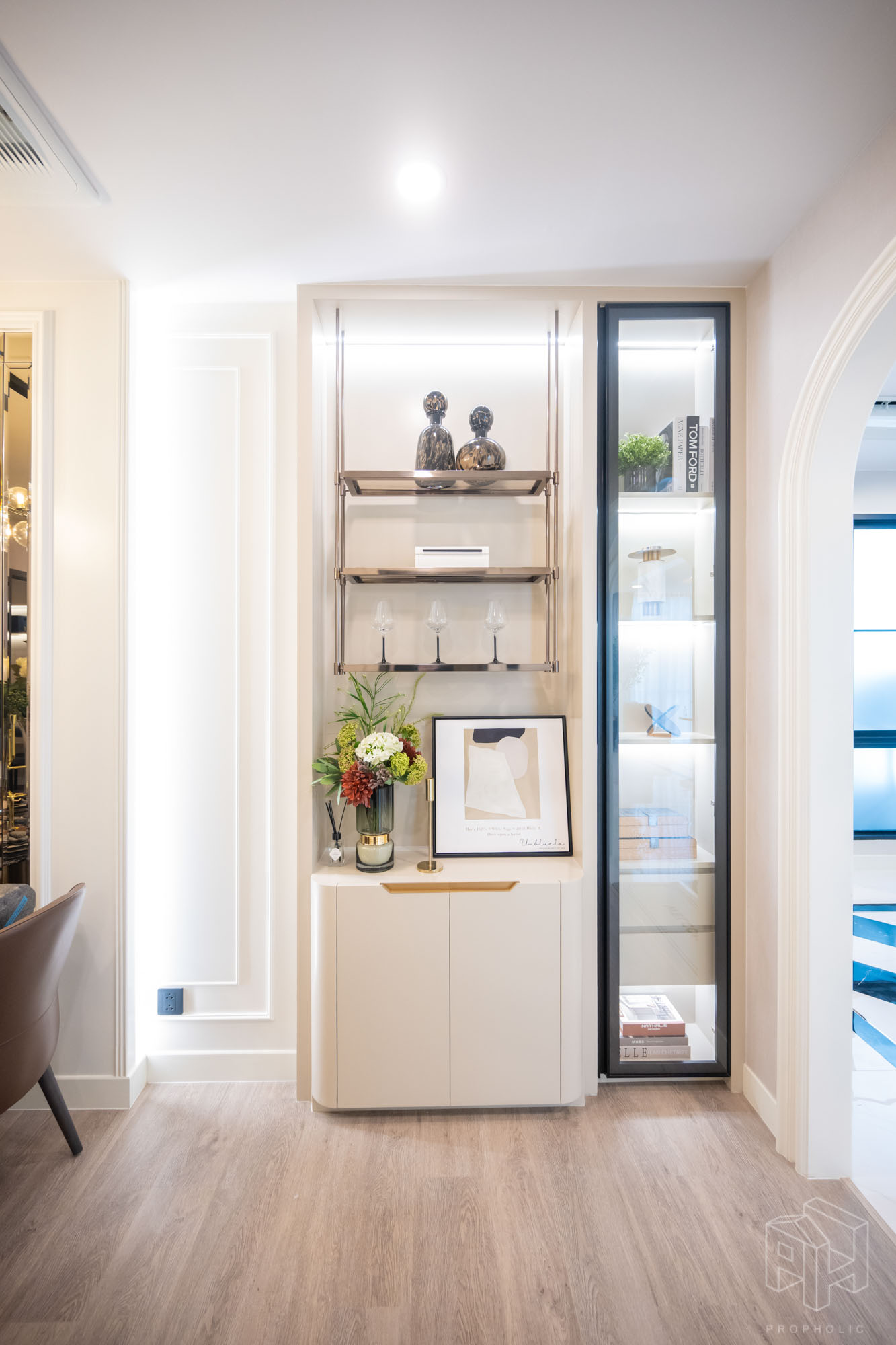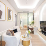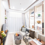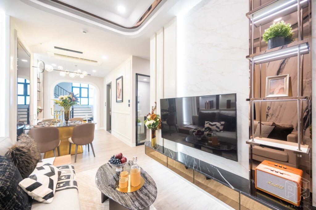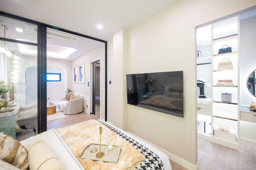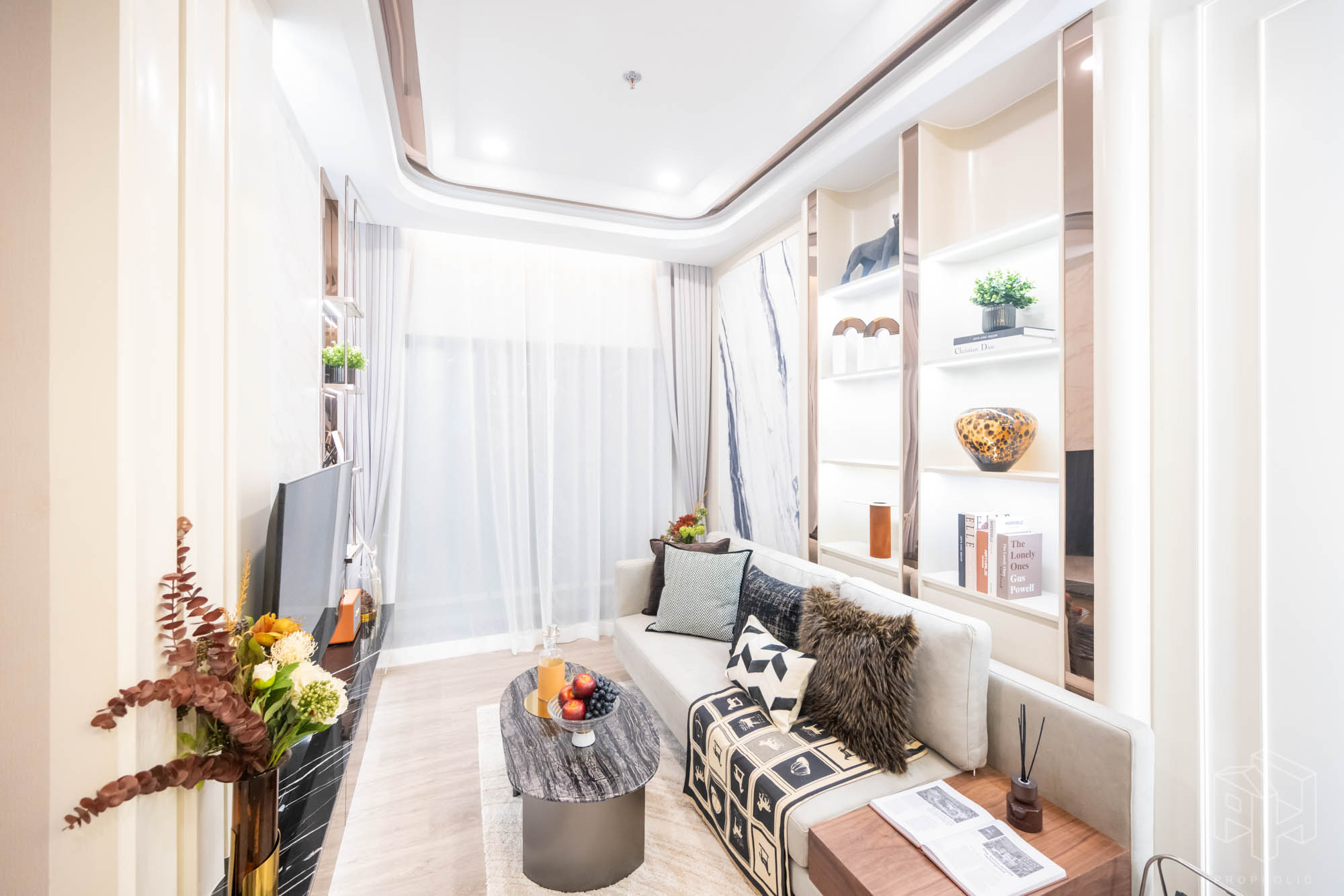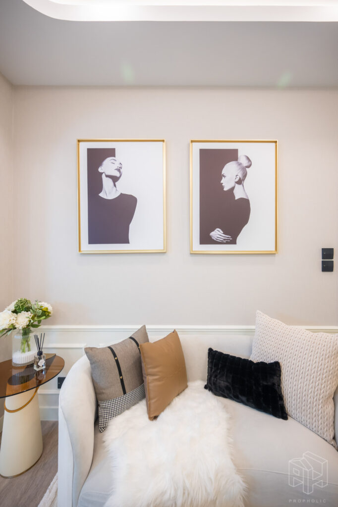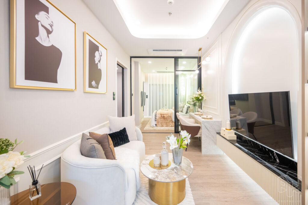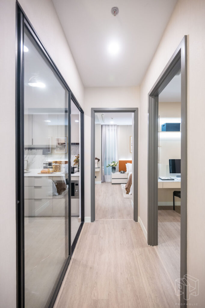 เปิดเข้ามาในห้องจะเป็นส่วนของห้องนั่งเล่นก่อน พื้นในห้องปูด้วย SPC เพดานห้องสูง 2.7 เมตร ผนังติด Wallpaper แบบมาตรฐานของทางโครงการ ให้แอร์แบบ Cassette Type 1 ทิศทาง พร้อม PM 1.0 Filter ที่ดูดี เสียงไม่ดัง