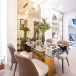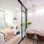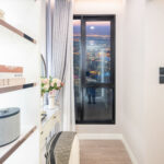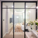 กั้นระหว่างห้องนั่งเล่นและห้องนอนด้วยประตูกระจกบานสไลด์ ส่วนโต๊ะทานอาหารวางแบบ 2 ที่นั่งได้ หรือใครอยากปรับให้เป็นมุมทำงานส่วนตัวก็ทำได้เช่นกัน