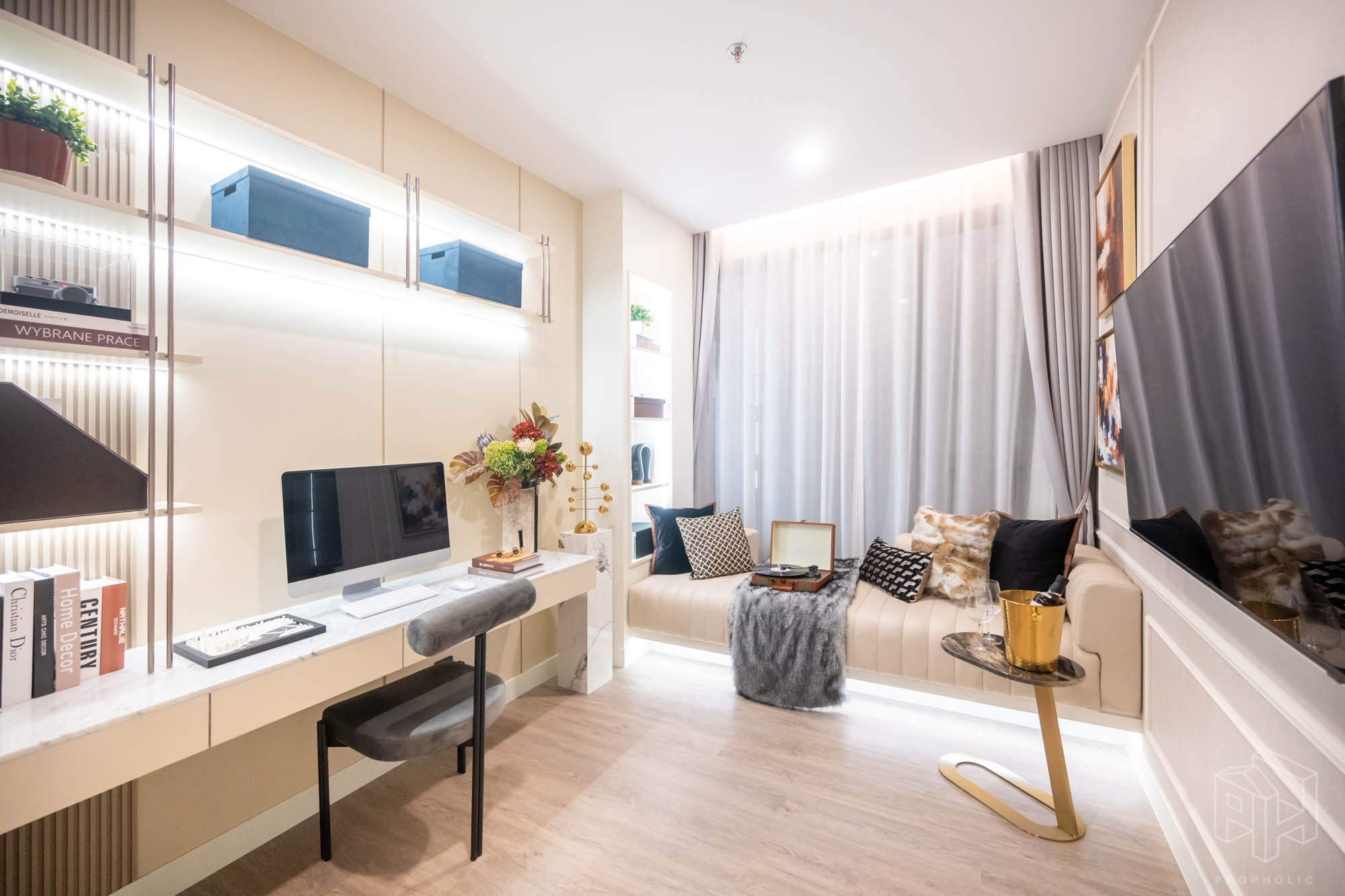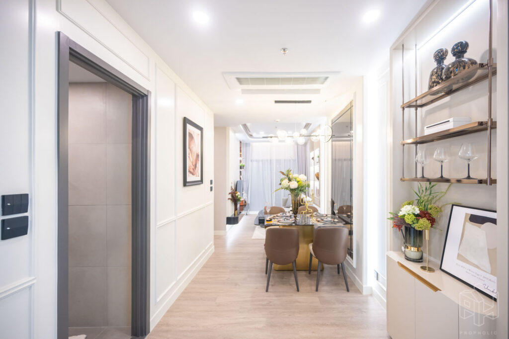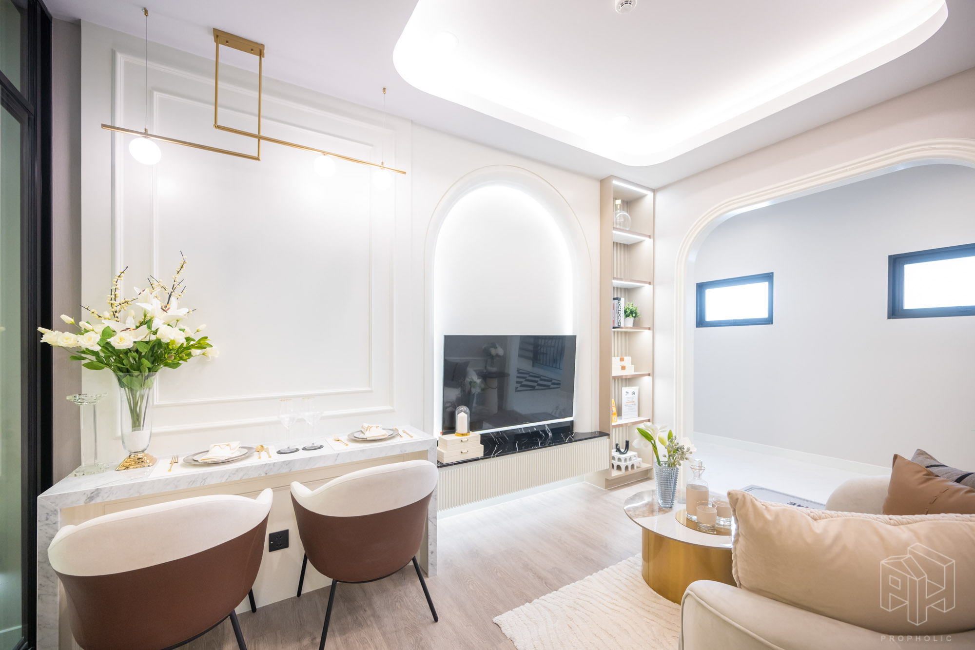 บริเวณหน้าห้องเป็นพื้นที่ของห้องนั่งเล่นและโต๊ะทานอาหาร ด้วยพื้นที่ห้องกว้าง สามารถวางตู้โชว์หรือชั้นวางรองเท้าไว้หน้าห้องได้ เพดานห้องสูง 2.7 เมตร ปูด้วยพื้น SPC พร้อมติด Wallpaper ภายในห้องให้ และแอร์แบบ Cassette Type 1 ทิศทาง พร้อม PM 1.0 Filter ที่ดูดี เสียงไม่ดัง