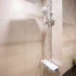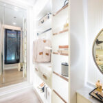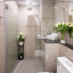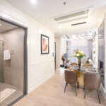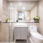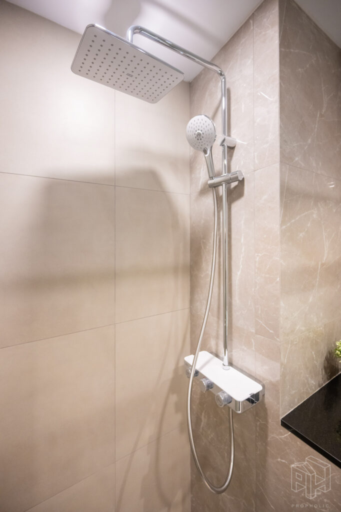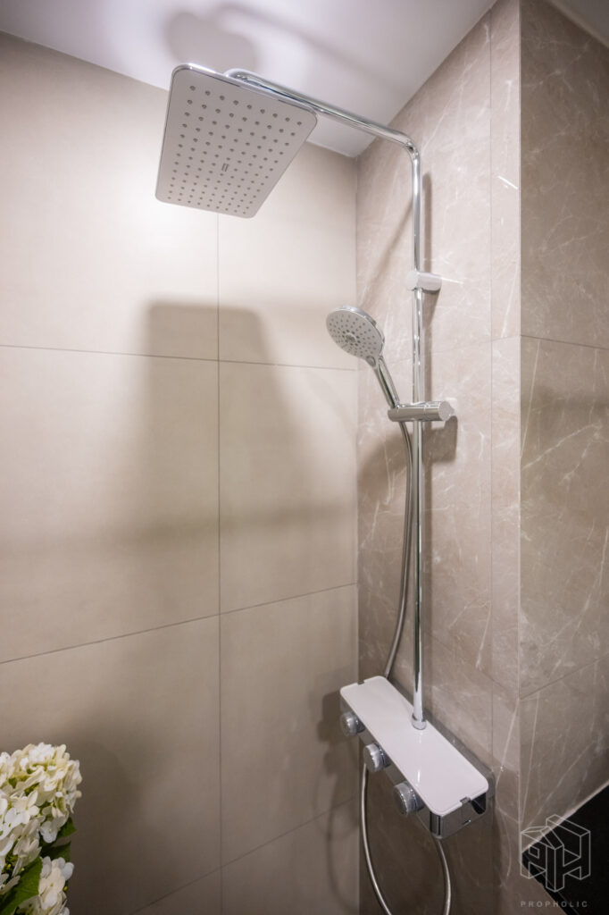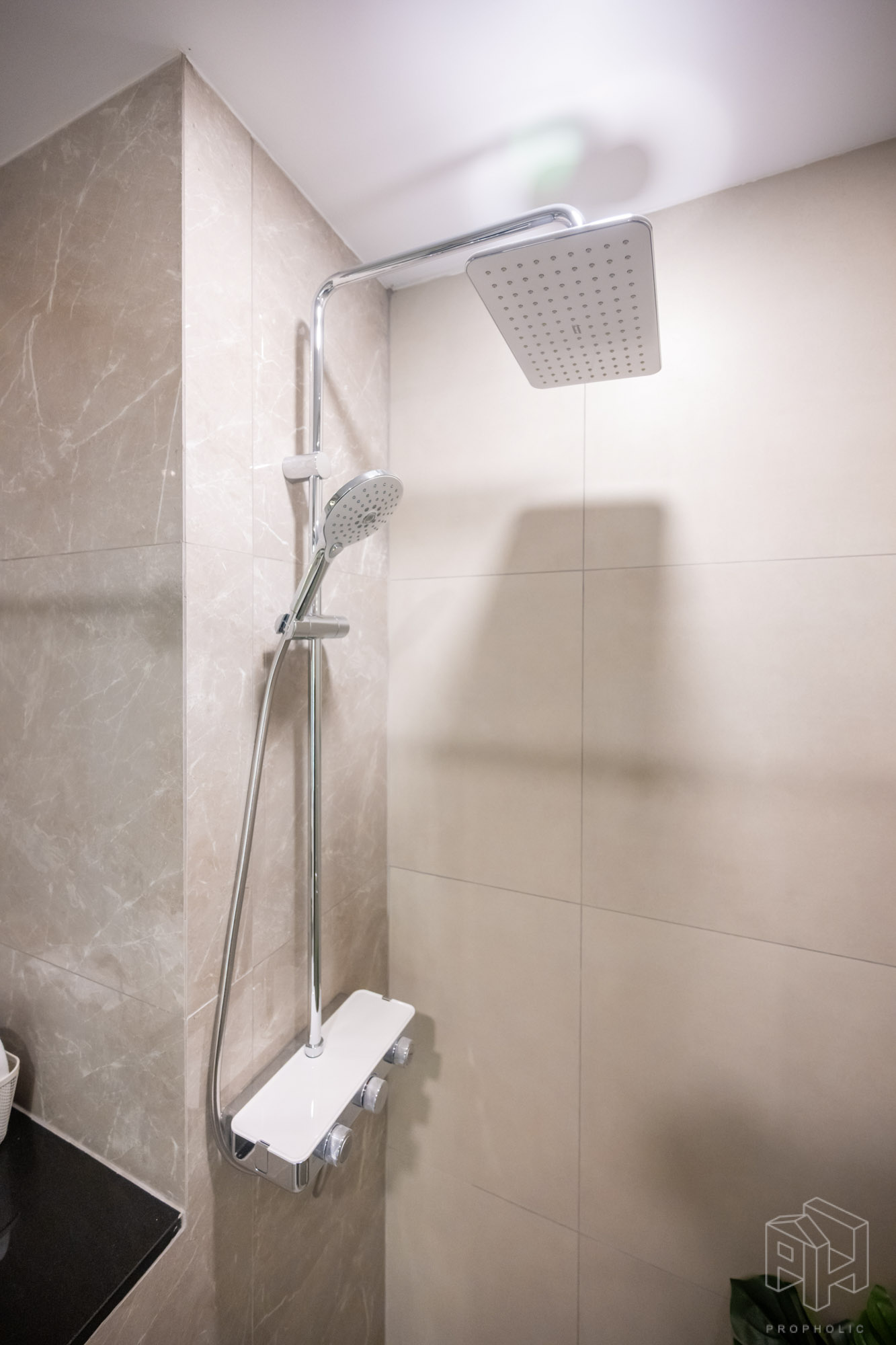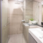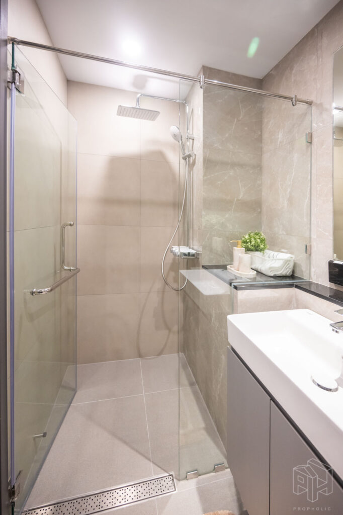 ซ้ายมือเป็นห้องน้ำ กั้นส่วนแห้งและเปียกให้ ใช้สุขภัณฑ์ American Standard ทั้งหมด และติดตั้ง Rain Shower ให้ทุกห้อง โดยสุขภัณฑ์เลือกใช้แบบ Comfort Clean ที่สามารถยับยั้งเชื้อ E.coli และแบคทีเรียชนิดอื่น ๆ ช่วยเสริมสุขอนามัยของผู้อยู่อาศัย