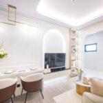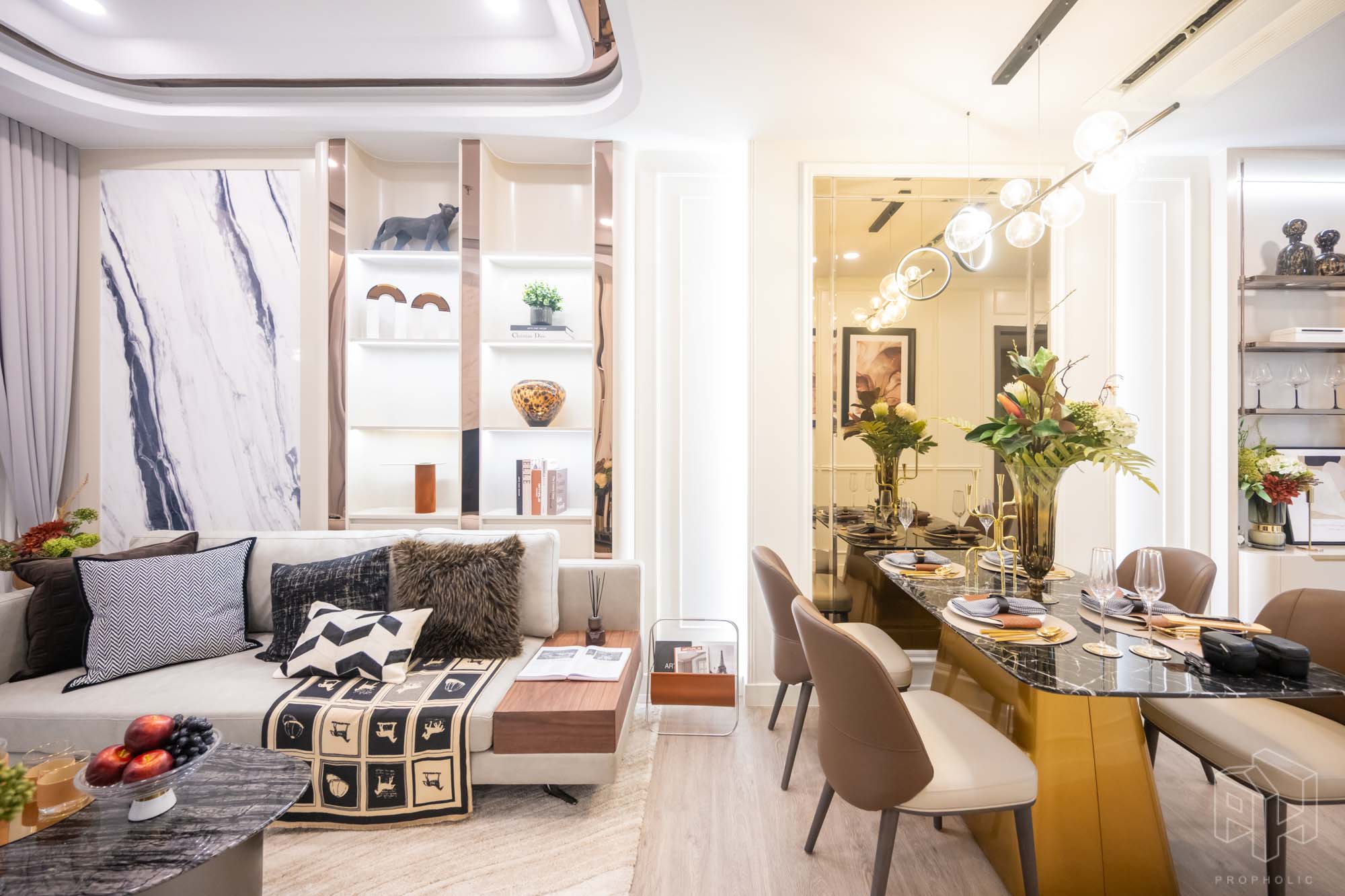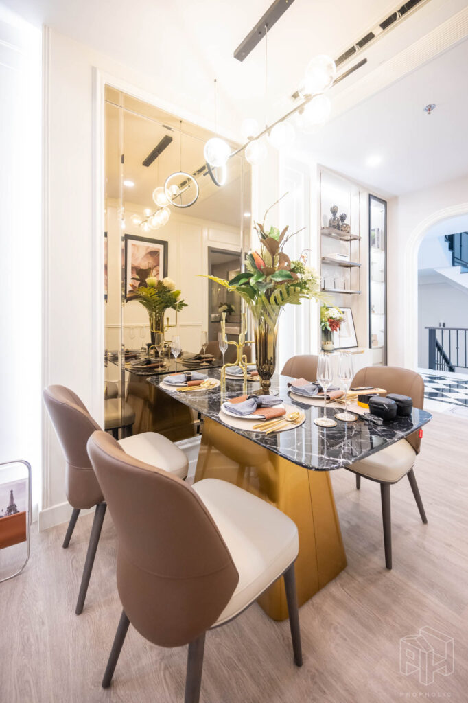 พื้นที่ห้องนั่งเล่นและโต๊ะทานอาหารเชื่อมต่อกัน พื้นที่ส่วนนี้กว้างสามารถใช้รับแขกได้กลายคน และวางโต๊ะทานอาหาร 4 – 6 ที่นั่งได้