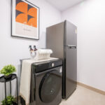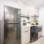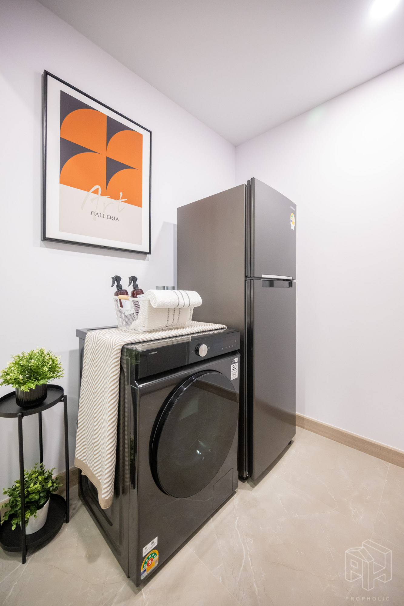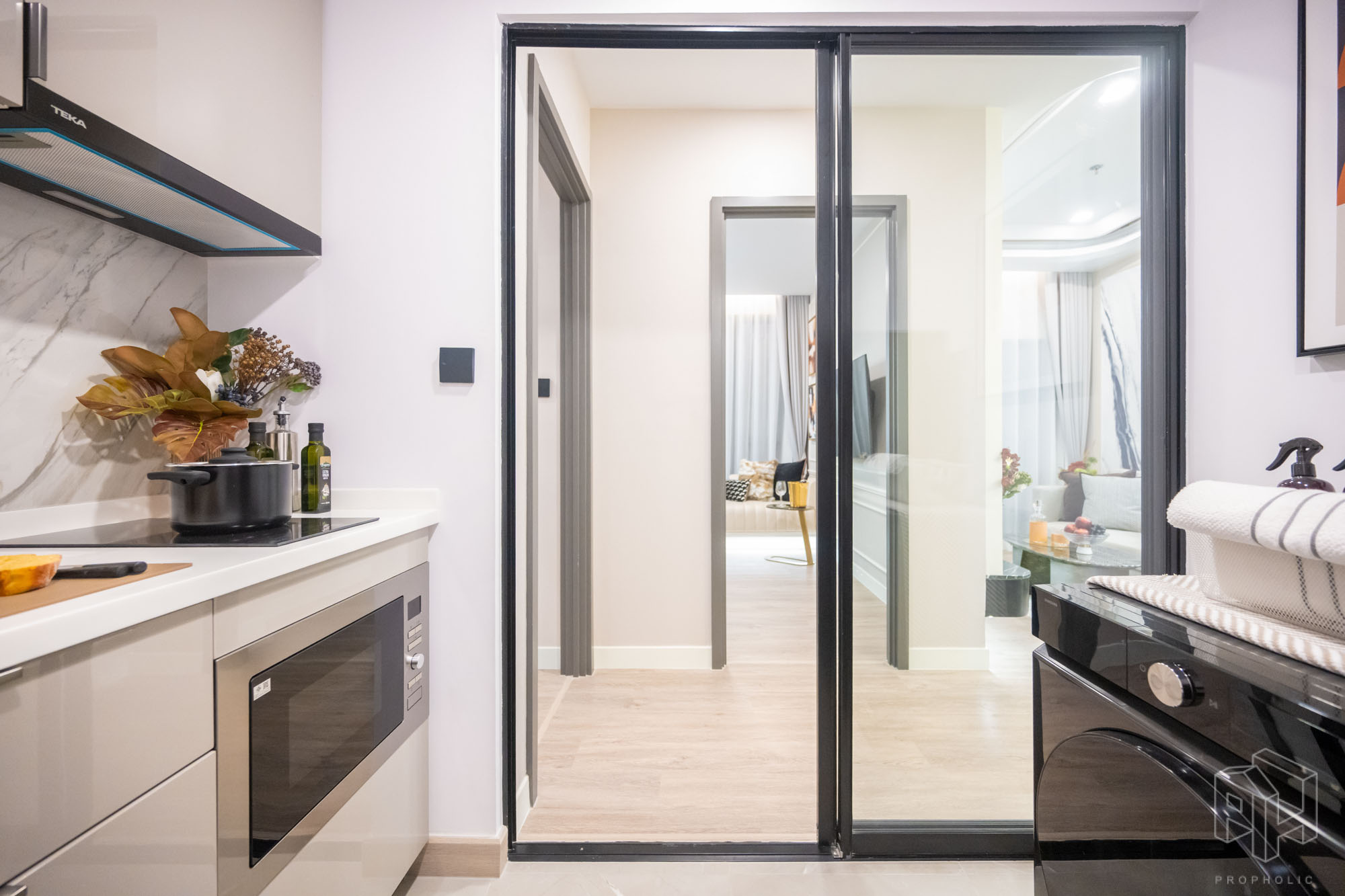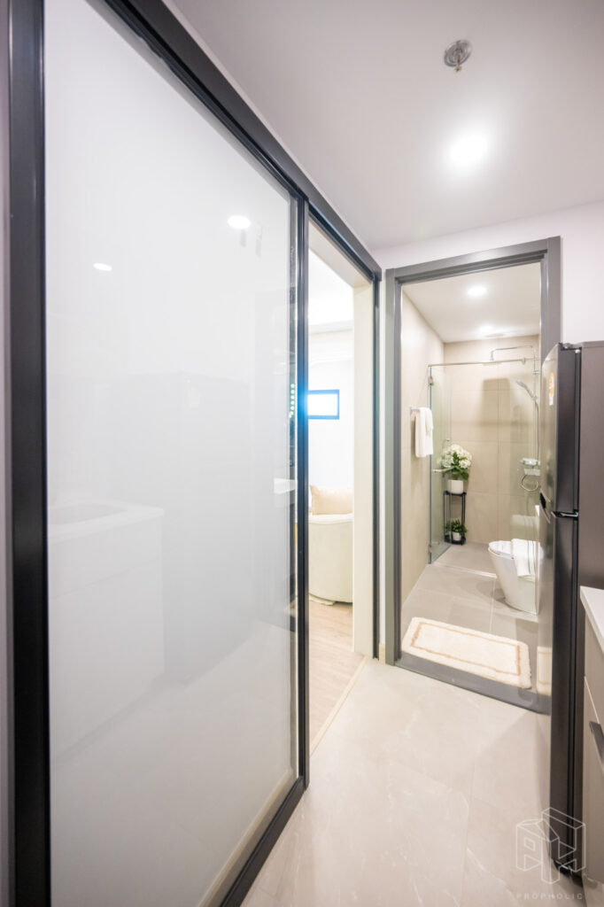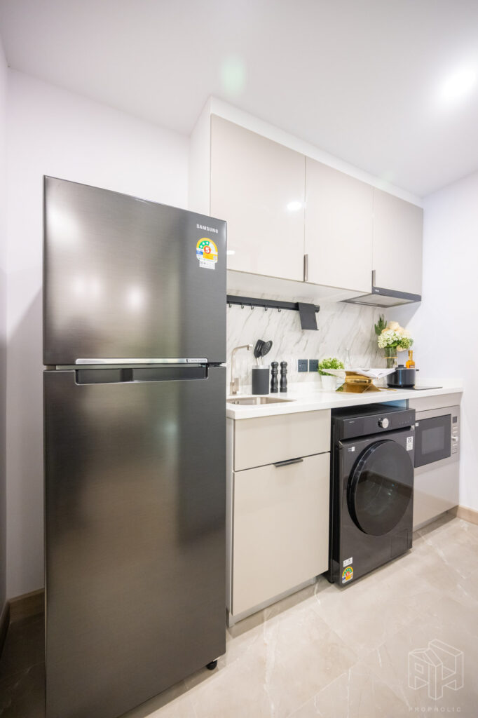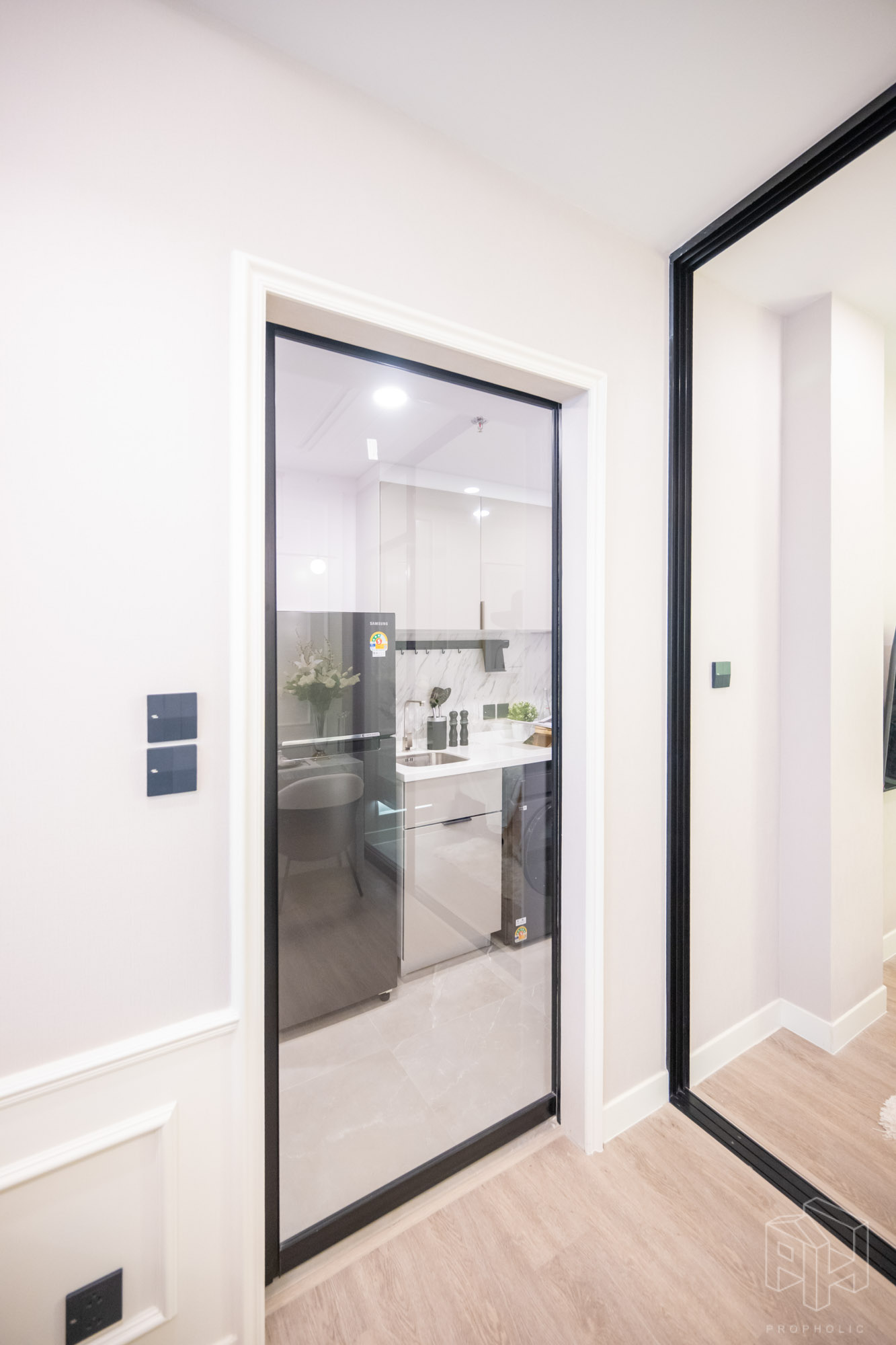 ฝั่งตรงข้ามเป็นครัว กั้นด้วยประตูกระจกบานสไลด์เป็นสัดส่วน ช่วยในเรื่องของกลิ่นรบกวนเวลาทำอาหาร พร้อมพื้นที่ซักล้างรวมอยู่ด้วยกัน