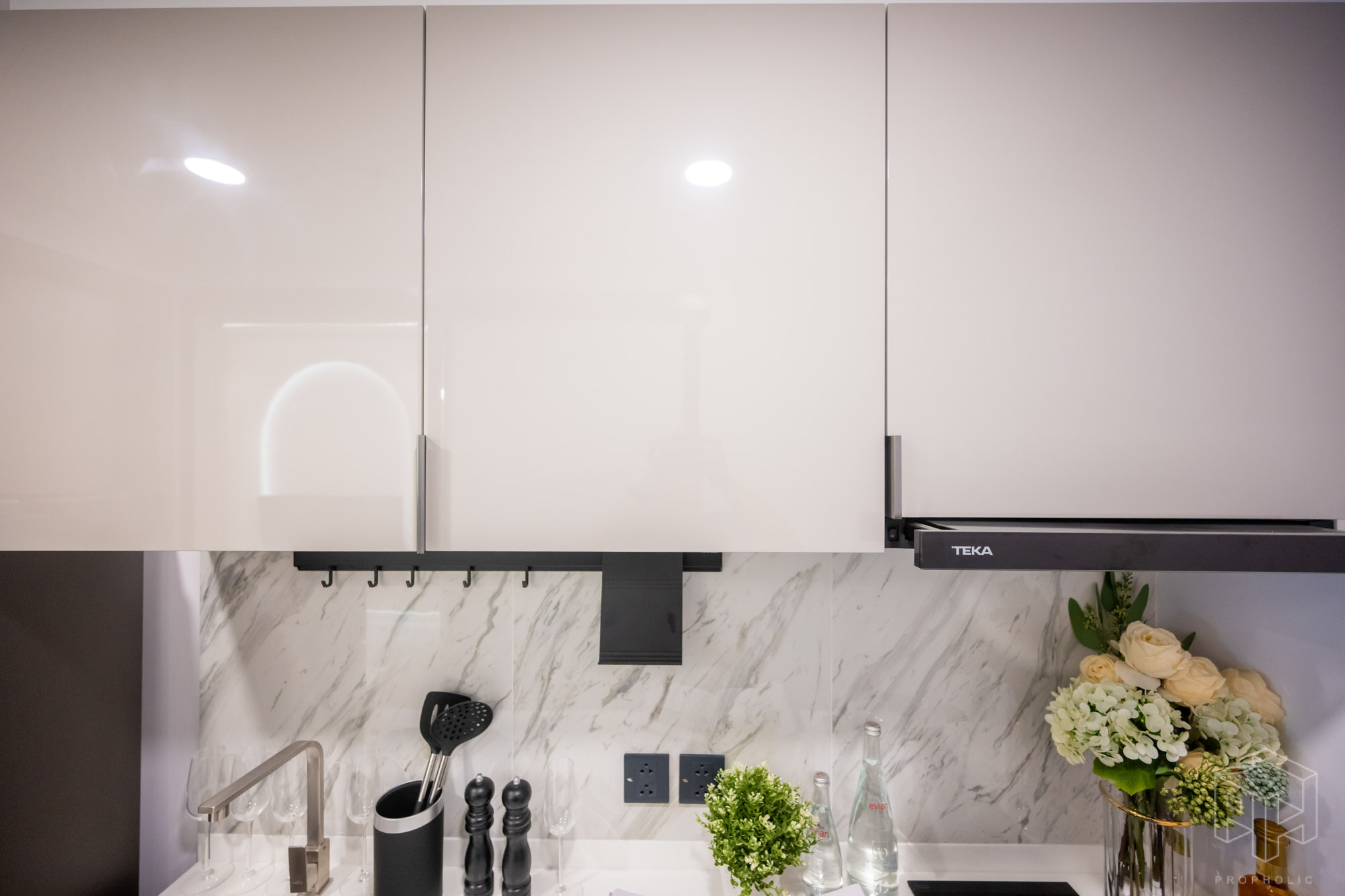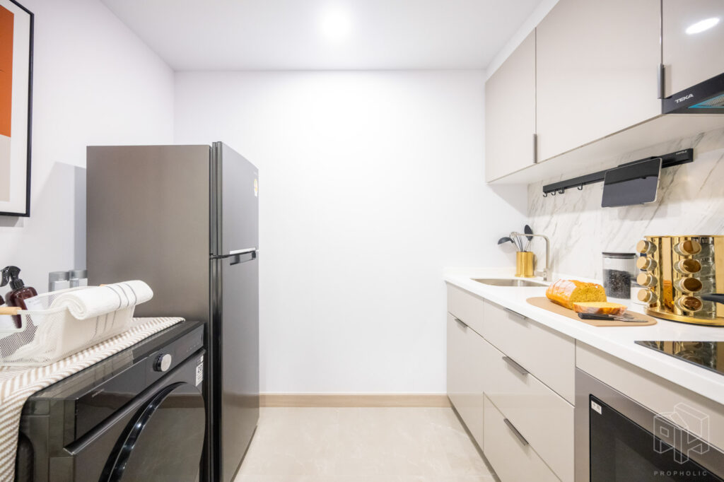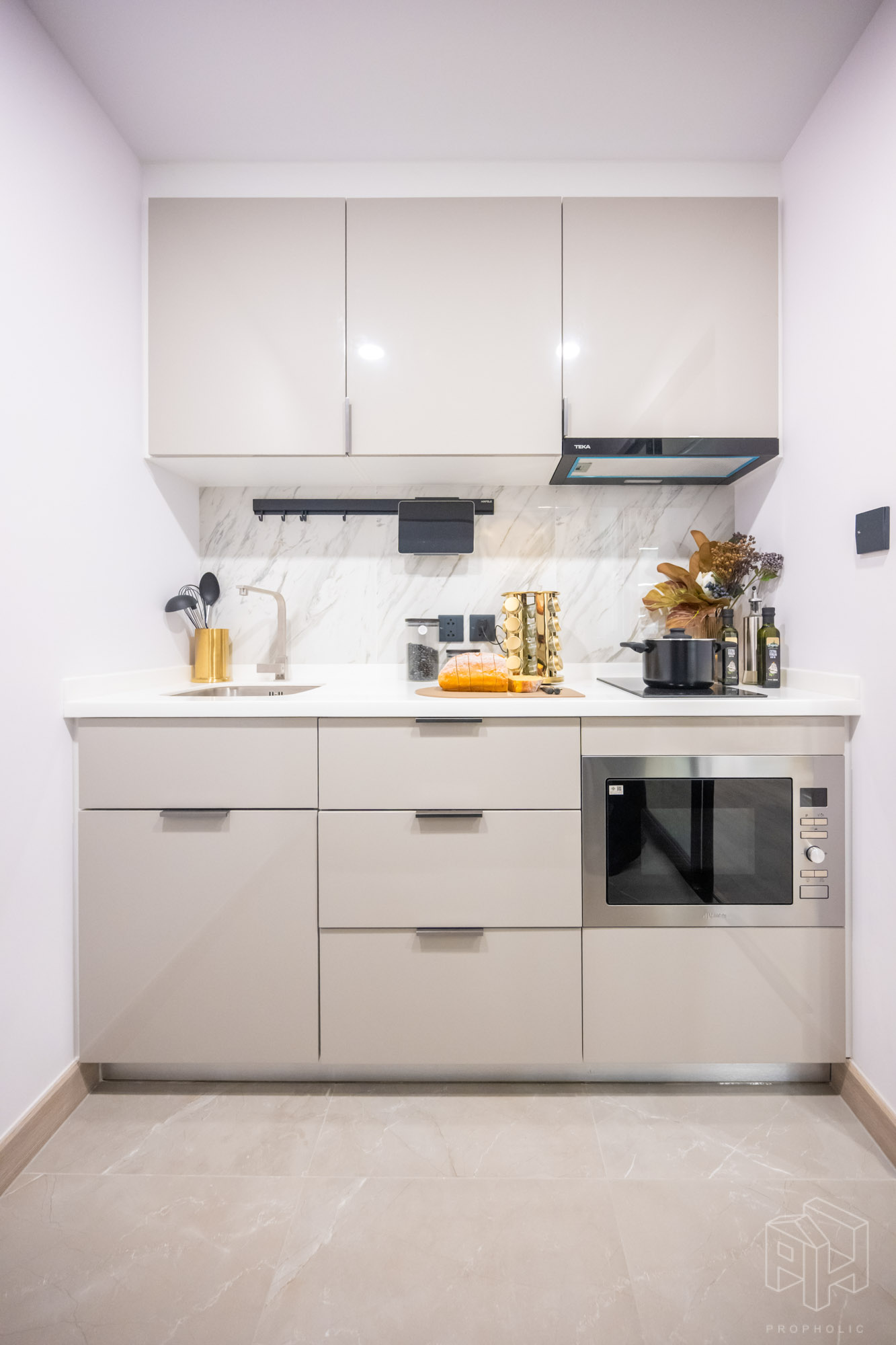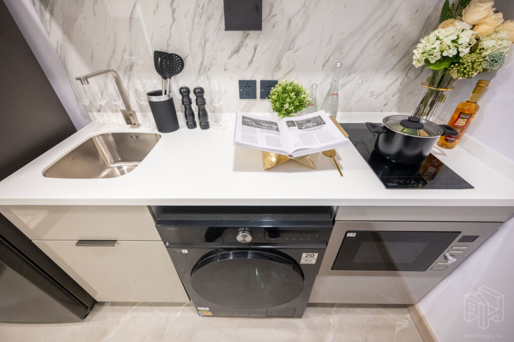 ในห้องจริงโครงการแถมครัวให้ทุกห้อง มีเคาน์เตอร์ครัวขนาดกะทัดรัด พร้อมตู้เก็บของด้านบนเหนือเคาน์เตอร์ ชุดครัวที่แถมมาด้วยก็จะเป็น Hob & Hood จาก Teka พร้อม Sink แบรนด์ MEX ติดตั้ง Backsplash ให้ พร้อมตู้เก็บของที่ติดตั้ง Pulldown สำหรับวางขวดเครื่องปรุงและอุปกรณ์ต่างๆ ในครัวได้ ดึงขึ้น-ลงได้อย่างสะดวก