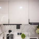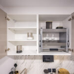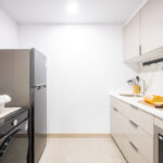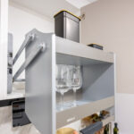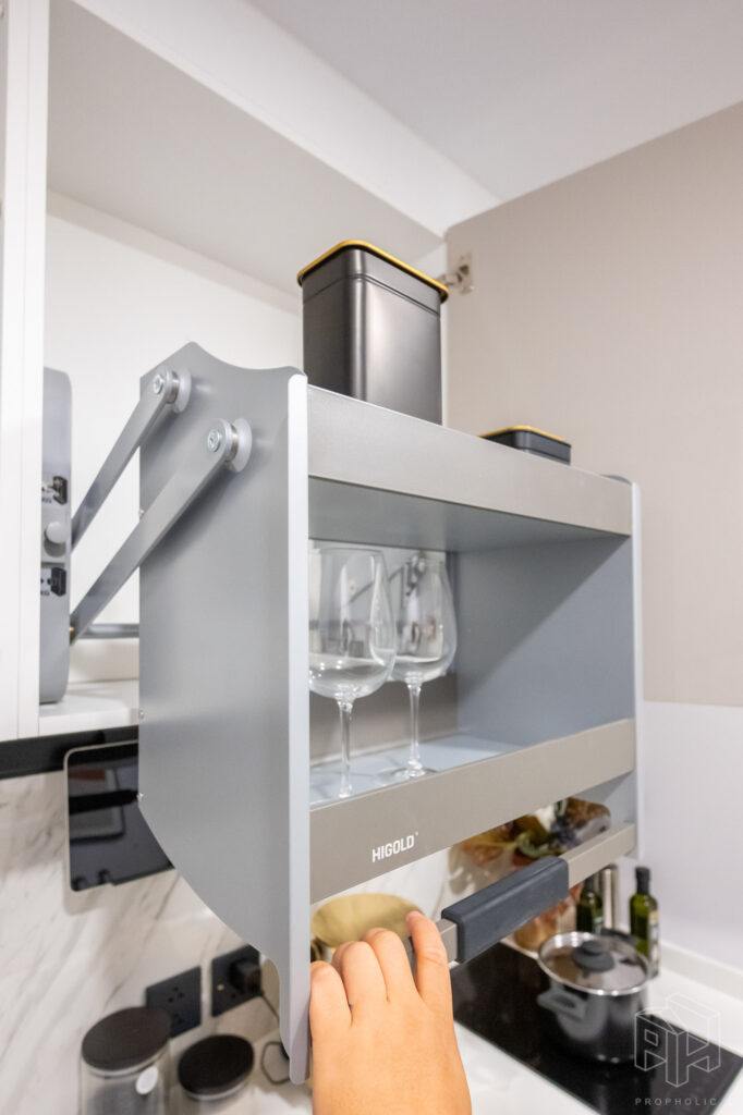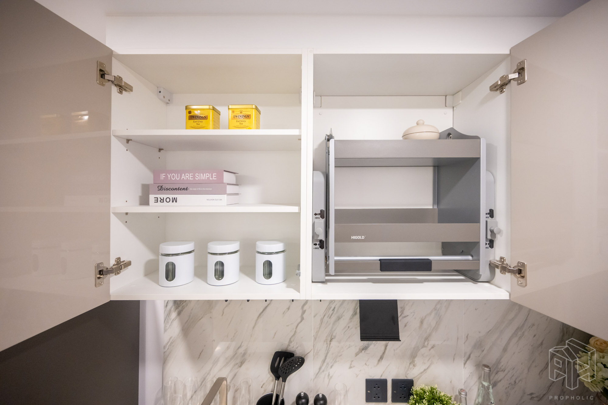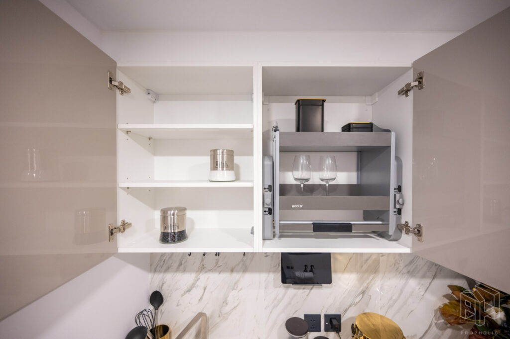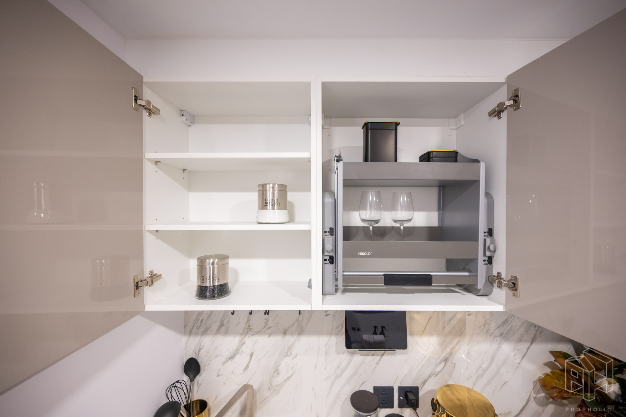 ในห้องจริงโครงการแถมครัวให้ทุกห้อง มีเคาน์เตอร์ครัวขนาดกะทัดรัด พร้อมตู้เก็บของด้านบนเหนือเคาน์เตอร์ ชุดครัวที่แถมมาด้วยก็จะเป็น Hob & Hood จาก Teka พร้อม Sink แบรนด์ MEX ติดตั้ง Backsplash ให้ พร้อมตู้เก็บของที่ติดตั้ง Pulldown สำหรับวางขวดเครื่องปรุงและอุปกรณ์ต่างๆ ในครัวได้ ดึงขึ้น-ลงได้อย่างสะดวก