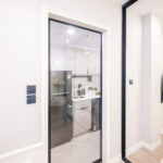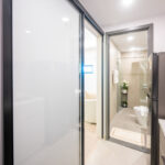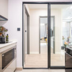 เราเข้ามาดูที่ฝั่งห้องครัวกันก่อน โดยครัวเป็นแบบปิดที่ติดประตูกระจกบานสไลด์ให้เป็นสัดส่วน ห้องครัวไม่มีช่องแสงด้านใน แต่มีพื้นที่ยืนทำอาหารพร้อมกันหลายคนได้