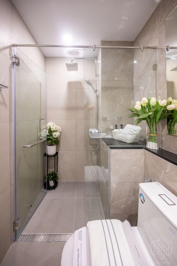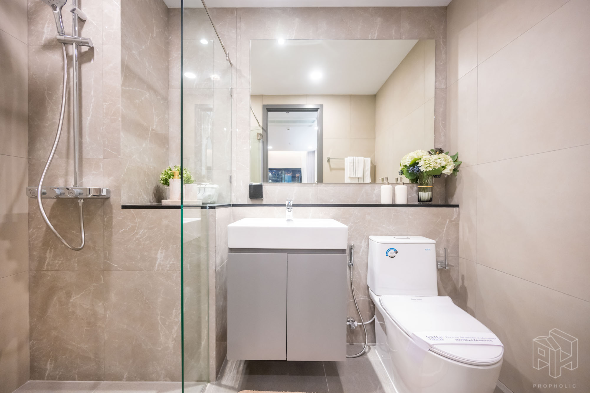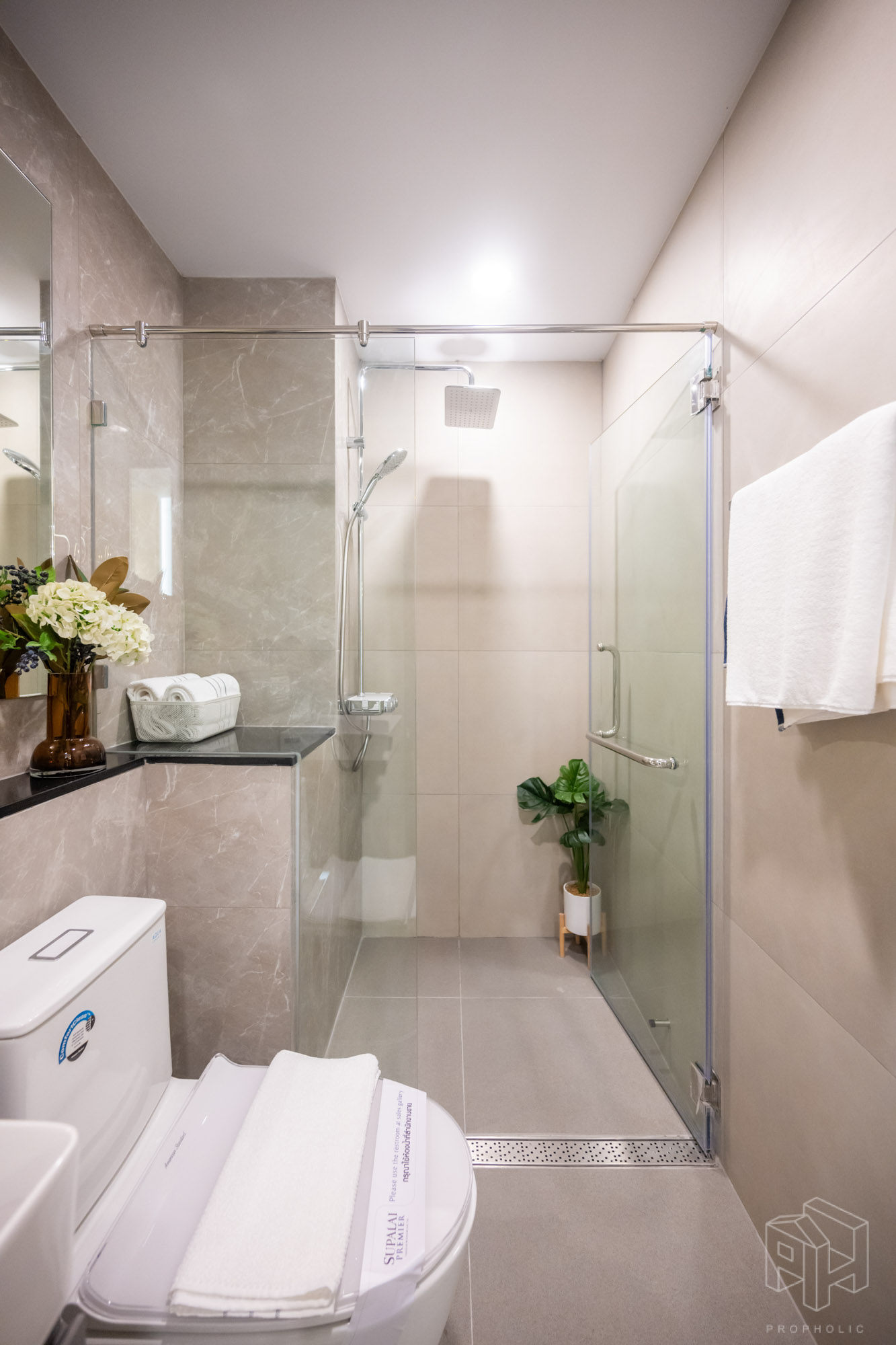 ในห้องน้ำใช้สุขภัณฑ์แบรนด์ American Standard ทั้งหมด ให้เครื่องทำน้ำร้อนไว้บริเวณในตู้ใต้อ่าง กั้น Shower Screen ให้ และติดตั้ง Rain Shower ในห้องอาบน้ำให้ทุกห้อง