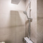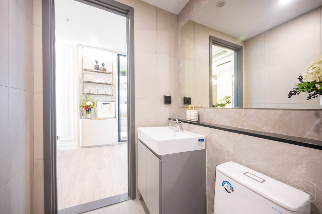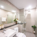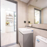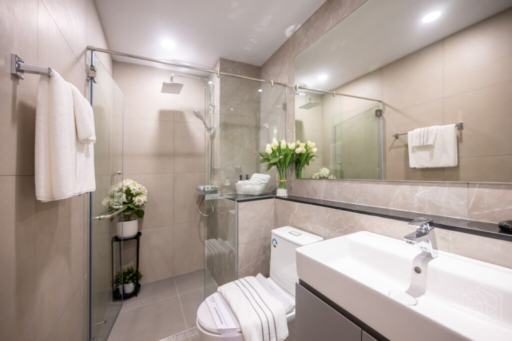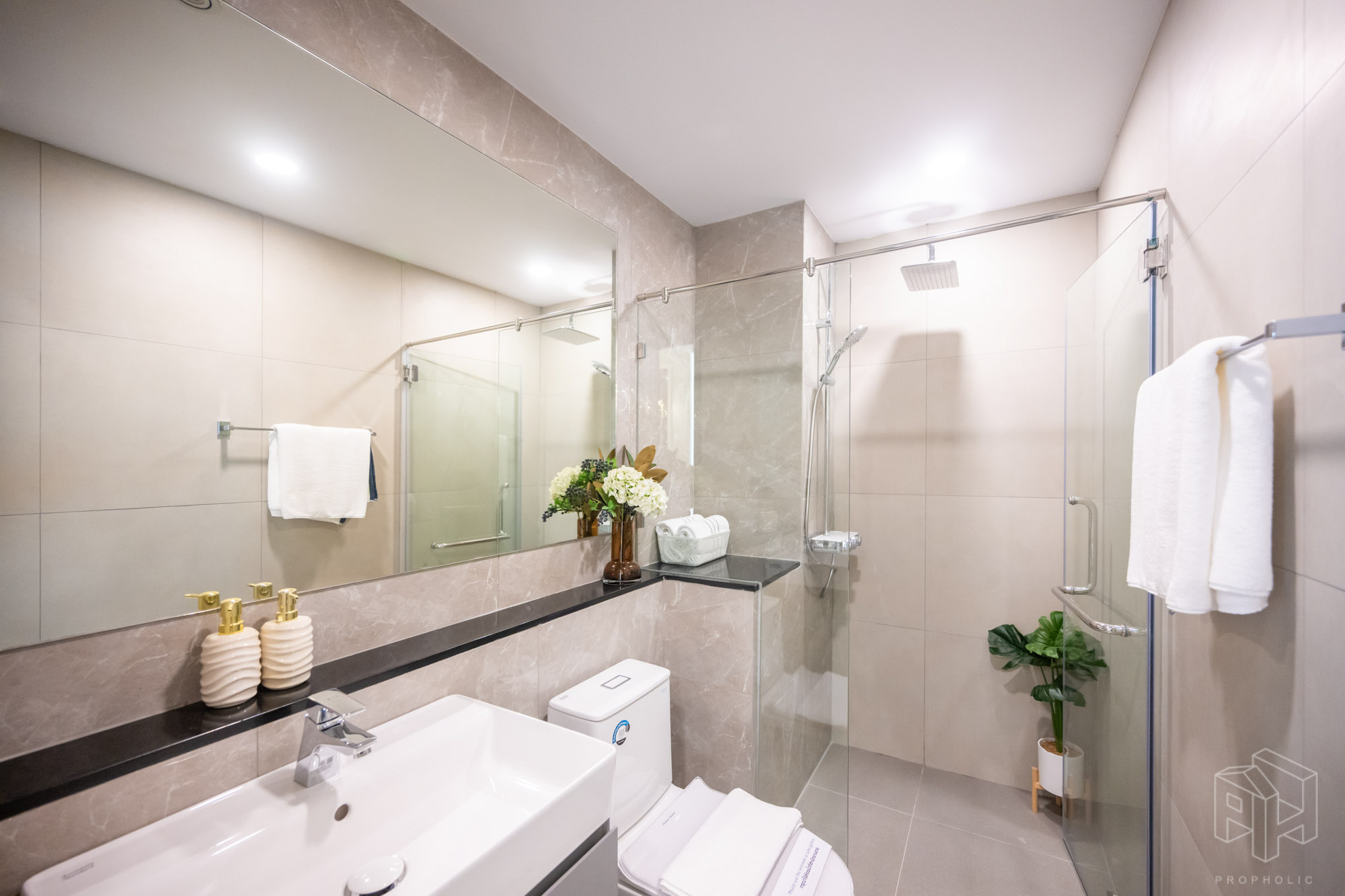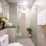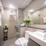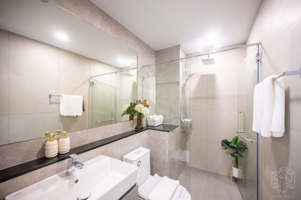 ในห้องน้ำใช้สุขภัณฑ์แบรนด์ American Standard ทั้งหมด ให้เครื่องทำน้ำร้อนไว้บริเวณในตู้ใต้อ่าง กั้น Shower Screen ให้ และติดตั้ง Rain Shower ในห้องอาบน้ำให้ทุกห้อง