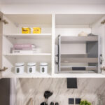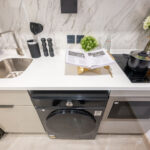ด้านล่างของเคาน์เตอร์ครัว มีช่องวางไมโครเวฟและเครื่องซักผ้าแบบฝาหน้า