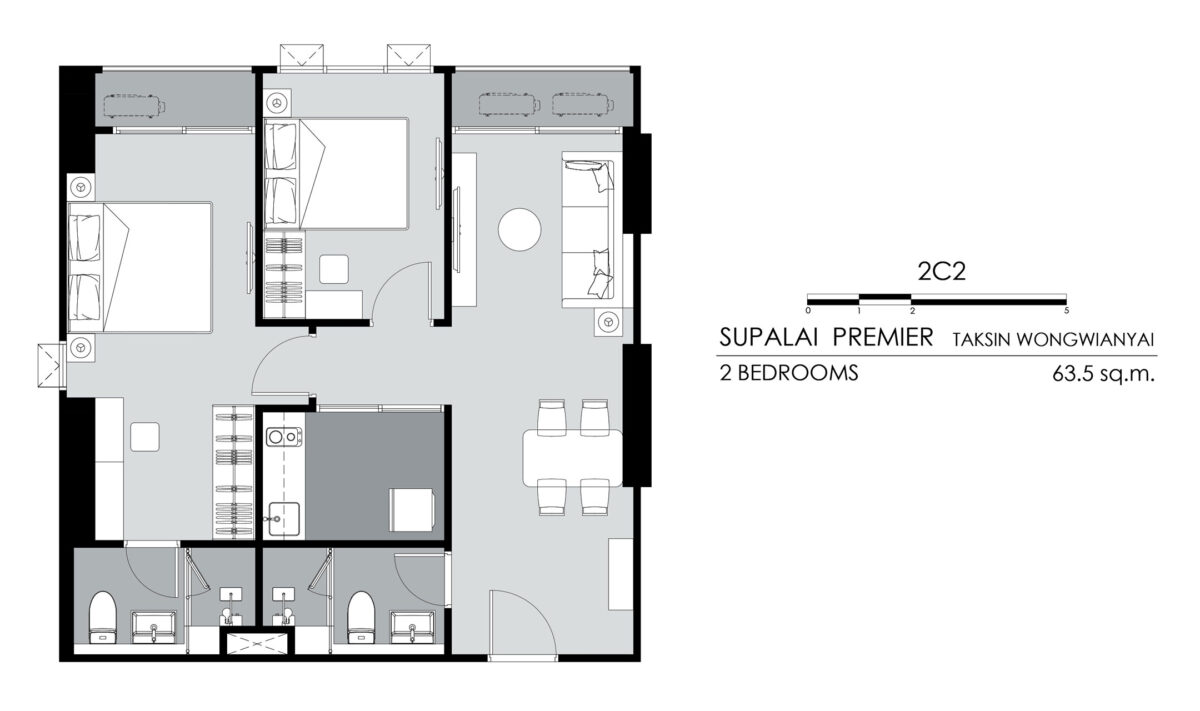 ห้อง 2 Bedroom ขนาด 63.5 ตารางเมตร แบบ 2 ห้องนอน 2 ห้องน้ำ เป็นห้องที่เหมาะกับครอบครัวขนาดเล็กและกลาง ห้องรับแขกและห้องนอนรับลมรับแสงธรรมชาติได้ทั้งวัน ห้องนอนขนาดใหญ่จัดพื้นที่โซนแต่งตัวได้ชัดเจน ภายในห้องมีระเบียง 2 จุด คือห้องนั่งเล่น และ Master Bedroom พร้อมครัวปิดพื้นที่กว้างที่มีพื้นที่ซักล้างในตัว