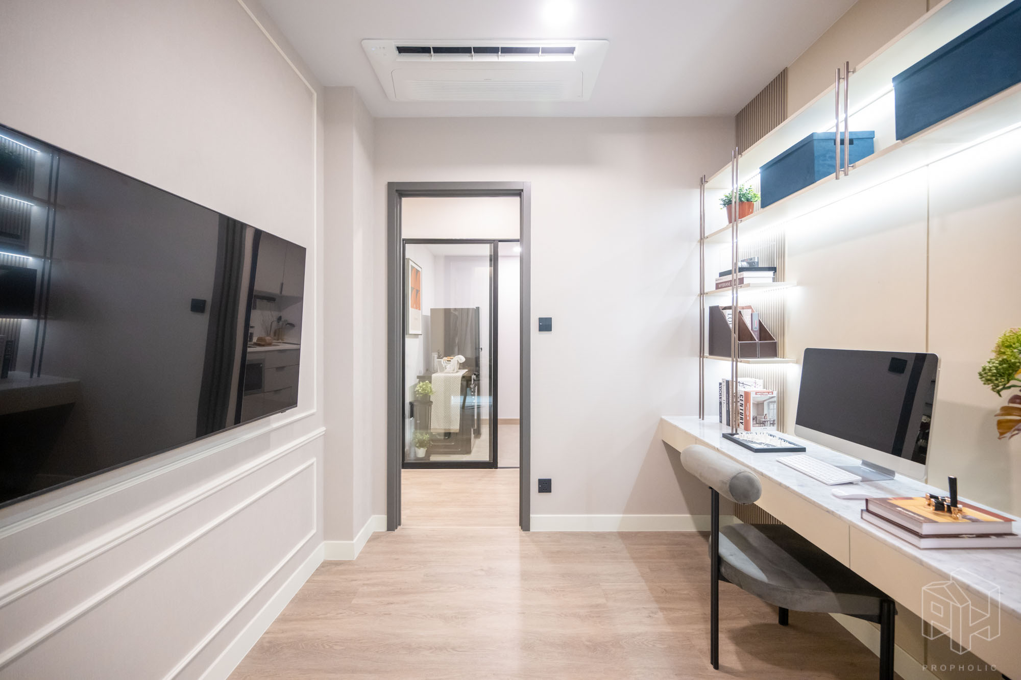ขวามือเป็นห้องนอนเล็กที่สามารถปรับฟังก์ชันห้องได้ตามต้องการ ไม่ว่าจะเป็นห้องนอน ห้องทำงาน หรือห้องเล่นเกม ดูหนังก็ยังได้