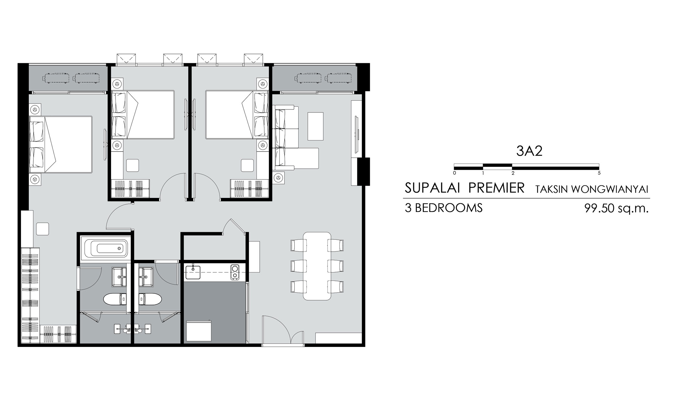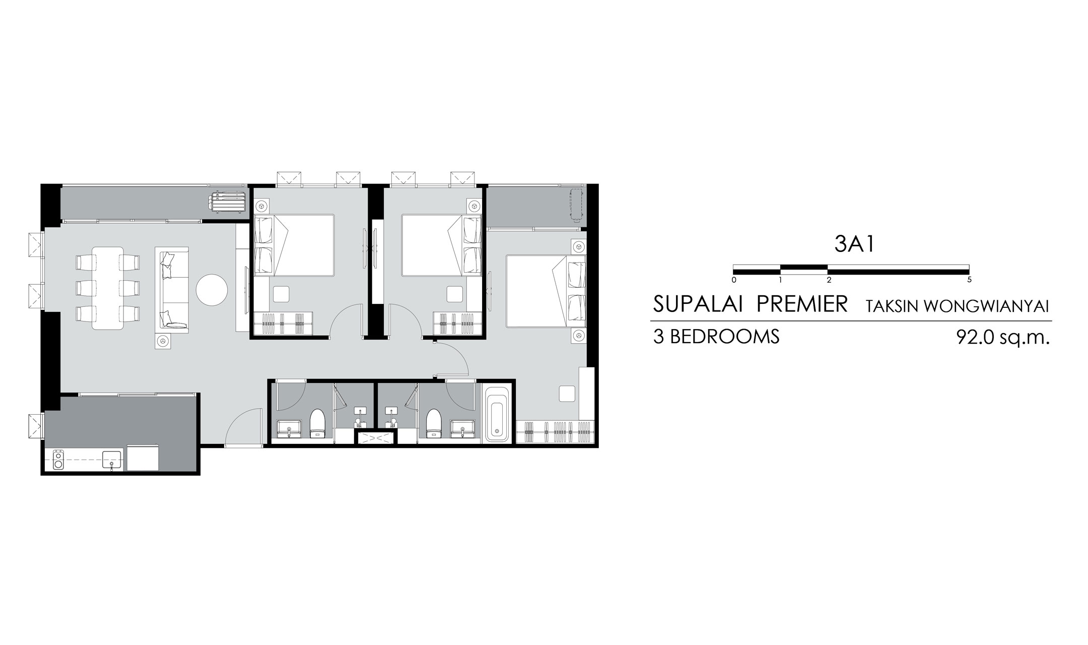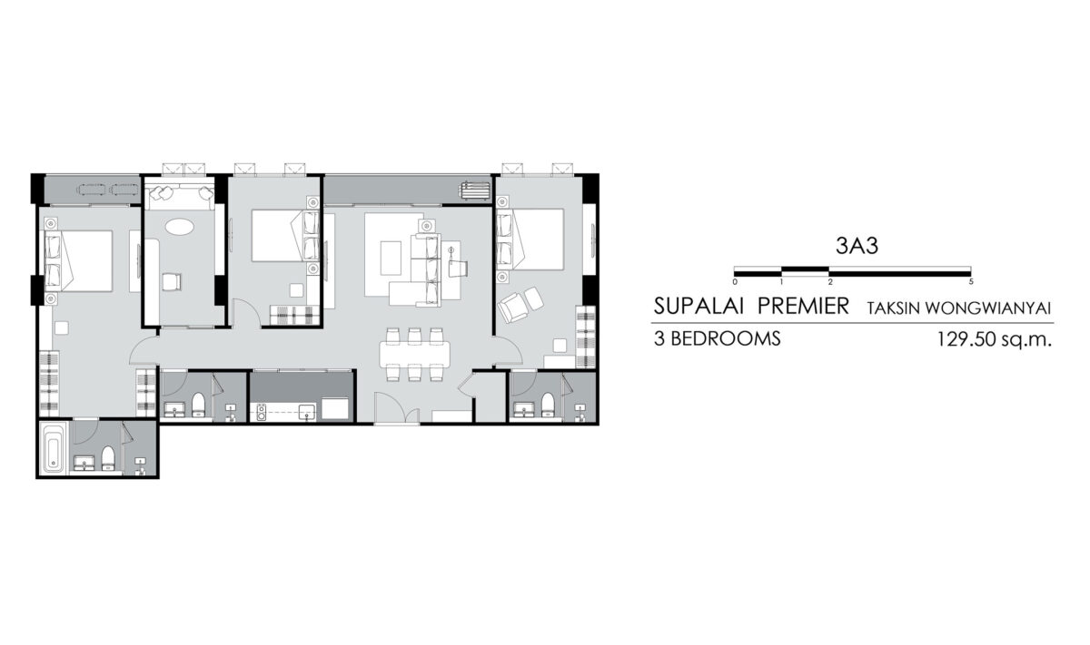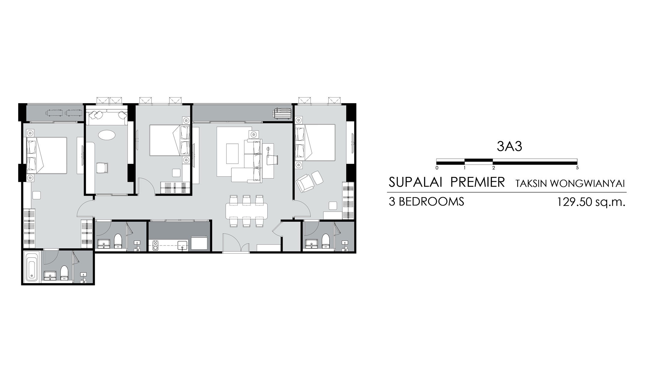 3 Bedroom ขนาด 92-129.5 ตารางเมตร มีให้เลือกทั้งแบบ 3 ห้องนอน 3 ห้องน้ำ และ 3 ห้องนอน 2 ห้องน้ำ โดยห้องนอนที่ 3 สามารถปรับฟังก์ชันเป็นห้องทำงานหรือห้องอเนกประสงค์อื่นๆ ได้ พื้นที่ห้องนั่งเล่นกว้าง และใน Master Bedroom มีอ่างอาบน้ำให้