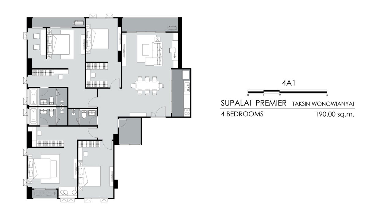 4 Bedroom ขนาด 190 ตารางเมตร ห้องไทป์ใหญ่สุดในโครงการ มีเพียง 1 ยูนิต เท่านั้น อยู่ที่ชั้น 38 แบบ 4 ห้องนอน 3 ห้องน้ำ มี Master Bedroom 2 ห้อง พร้อมอ่างอาบน้ำในตัว ห้องนอนเล็ก 2 ห้องใช้ห้องน้ำรวมกัน สามารถปรับฟังก์ชันการใช้งานห้องได้ตามใจชอบ พื้นที่ห้องนั่งเล่นกว้าง และได้ครัวแบบปิด ภายในห้องมีพื้นที่ห้องเก็บห้อง สำหรับวางเครื่องซักผ้าและเก็บของ ตอบโจทย์การอยู่อาศัยแบบครอบครัวใหญ่ที่มีสมาชิก 4 – 5 คน ได้สบาย