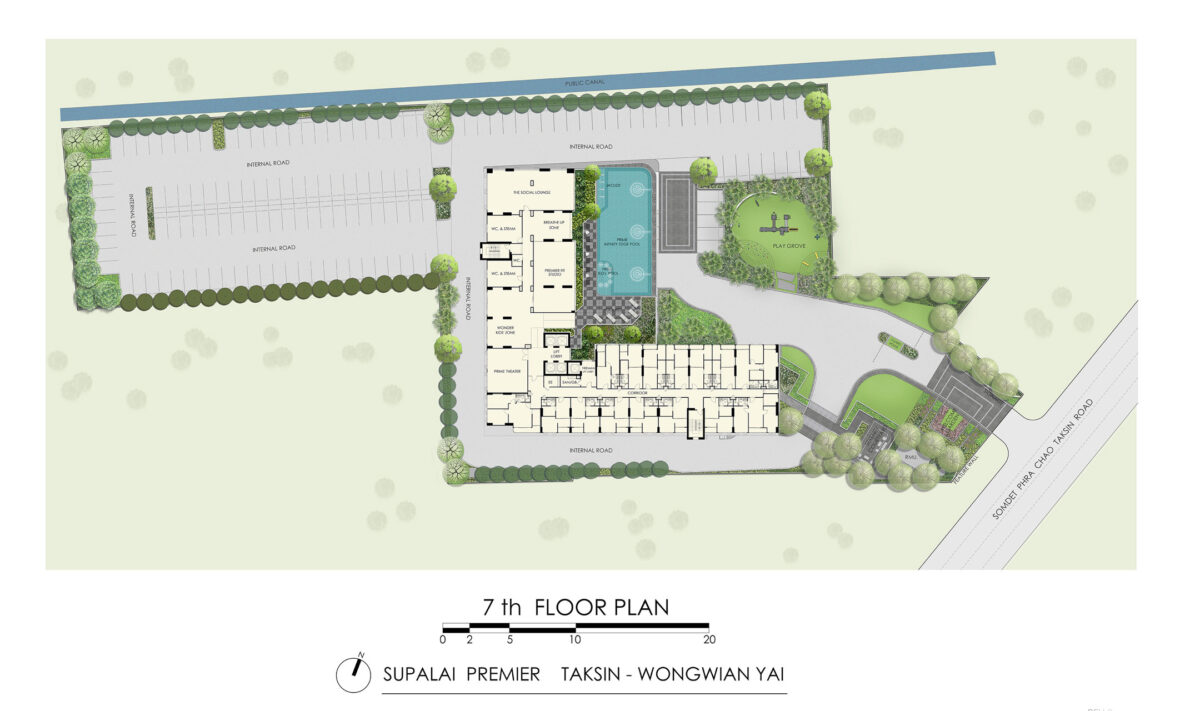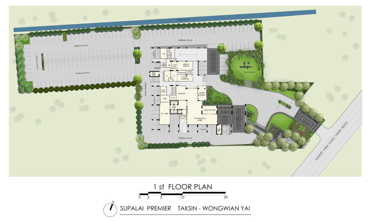 โครงการมีทางเข้า – ออก ทางเดียวติดกับถนนสมเด็จพระเจ้าตากสิน ทำเลศักยภาพที่เดินทางสะดวก ใกล้รถไฟฟ้าและถนนสายหลักหลายสาย บริเวณทางเข้าเต็มไปด้วยพื้นที่สีเขียวยาวไปจนถึงด้านหน้าอาคาร ที่ดินของโครงการเป็นรูปตัว L มีพื้นที่จอดรถรอบอาคารยาวไปจนถึงพื้นที่ด้านหลัง โดยอาคารรูปตัว L ทำหน้าที่ช่วยลดความร้อนจากแสงแดดในช่วงบ่าย และเปิดรับลมธรรมชาติเข้าสู่พื้นที่ส่วนกลาง ทำให้บรรยากาศร่มรื่น เย็นสบาย และช่วยลดภาระการใช้พลังงานภายในอาคาร