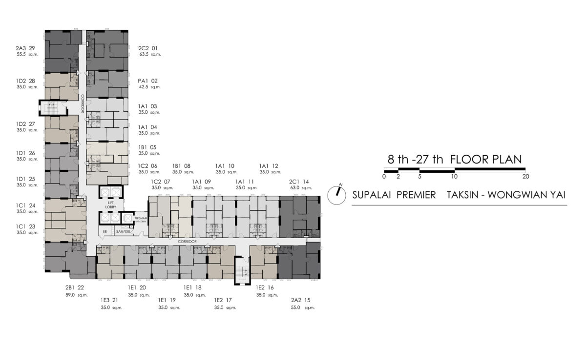 ชั้น 8 – 27 ห้องพักอาศัยที่มีแบบ 1 Bedroom และ 2 Bedroom เป็นห้องมุมทุกชั้น