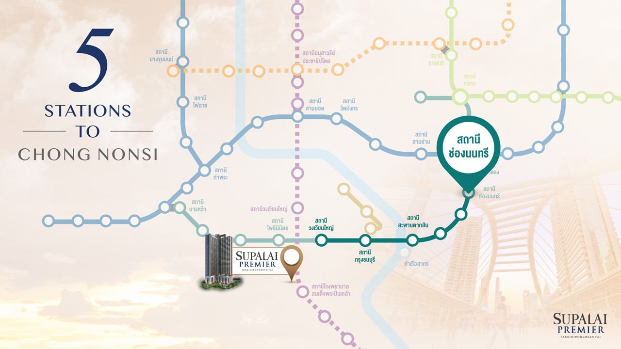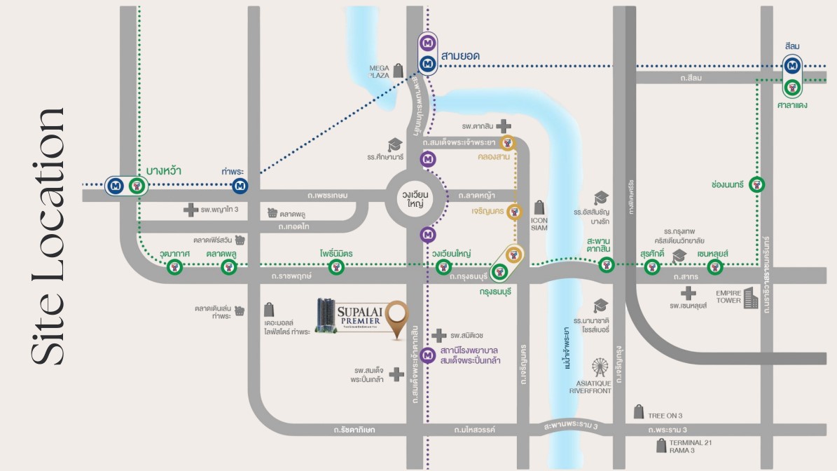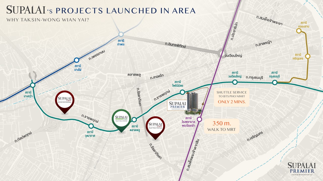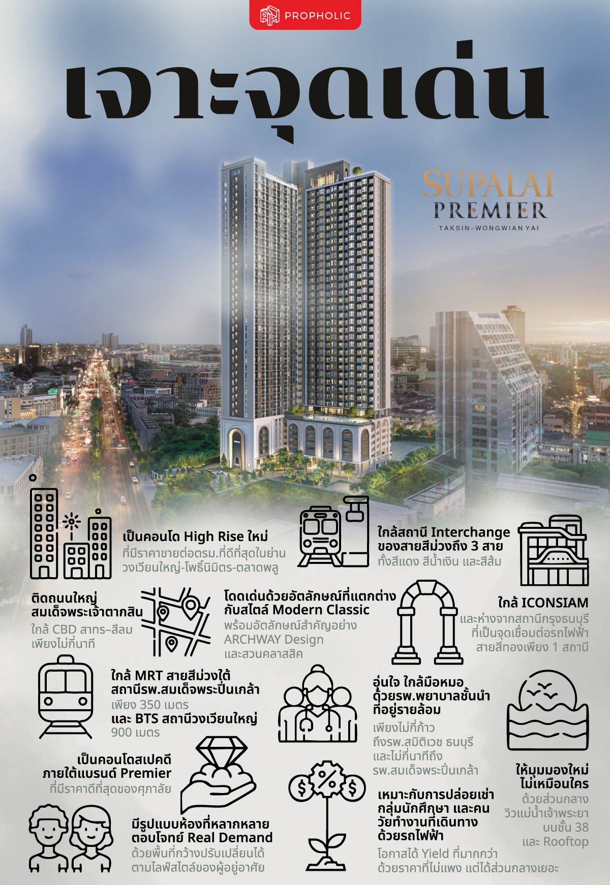 เป็นคอนโด Hi Rise ใหม่ ที่มีราคาขายต่อตารางเมตรที่ดีที่สุดในย่านวงเวียนใหญ่ – โพธิ์นิมิต – ตลาดพลู ติดถนนใหญ่สมเด็จพระเจ้าตากสิน ใกล้ CBD สาทร – สีลม เพียงไม่กี่นาที ใกล้ MRT สายสีม่วงใต้ สถานีโรงพยาบาลสมเด็จพระปิ่นเกล้า เพียง 350 เมตร และ BTS สถานีวงเวียนใหญ่ 900 เมตร ใกล้สถานี Interchange ของสายสีม่วงถึง 3 สาย ทั้งสีแดง สีน้ำเงิน และสีส้ม ใกล้ ICONSIAM และห่างจากสถานีกรุงธนบุรี ที่เป็นจุดเชื่อมต่อรถไฟฟ้าสายสีทองเพียง 1 สถานี อุ่นใจ ใกล้มือหมอด้วยโรงพยาบาลชั้นนำที่อยู่รายล้อม เพียงไม่กี่ก้าวถึงโรงพยาบาลสมิติเวช ธนบุรี และไม่กี่นาทีถึงโรงพยาบาลสมเด็จพระปิ่นเกล้า โครงการเป็นคอนโดสเปคดีภายใต้แบรนด์ Premier ที่มีราคาดีที่สุดของศุภาลัย โดดเด่นด้วยอัตลักษณ์ที่แตกต่างกับสไตล์ Modern Classic พร้อมอัตลักษณ์สำคัญอย่าง ARCHWAY Design และสวนคลาสสิค ให้มุมมองใหม่ไม่เหมือนใครด้วยส่วนกลางวิวแม่น้ำเจ้าพระยา บนชั้น 38 และ Rooftop มีรูปแบบห้องที่หลากหลายตอบโจทย์ Demand ด้วยพื้นที่กว้างปรับเปลี่ยนได้ ตามสไตล์ของผู้อยู่อาศัย เหมาะกับการปล่อยเช่ากลุ่มนักศึกษา และคนวัยทำงานที่เดินทางด้วยรถไฟฟ้า โอกาสได้ Yield ที่มากกว่า ด้วยราคาที่ไม่แพง แต่ได้ส่วนกลางเยอะ
