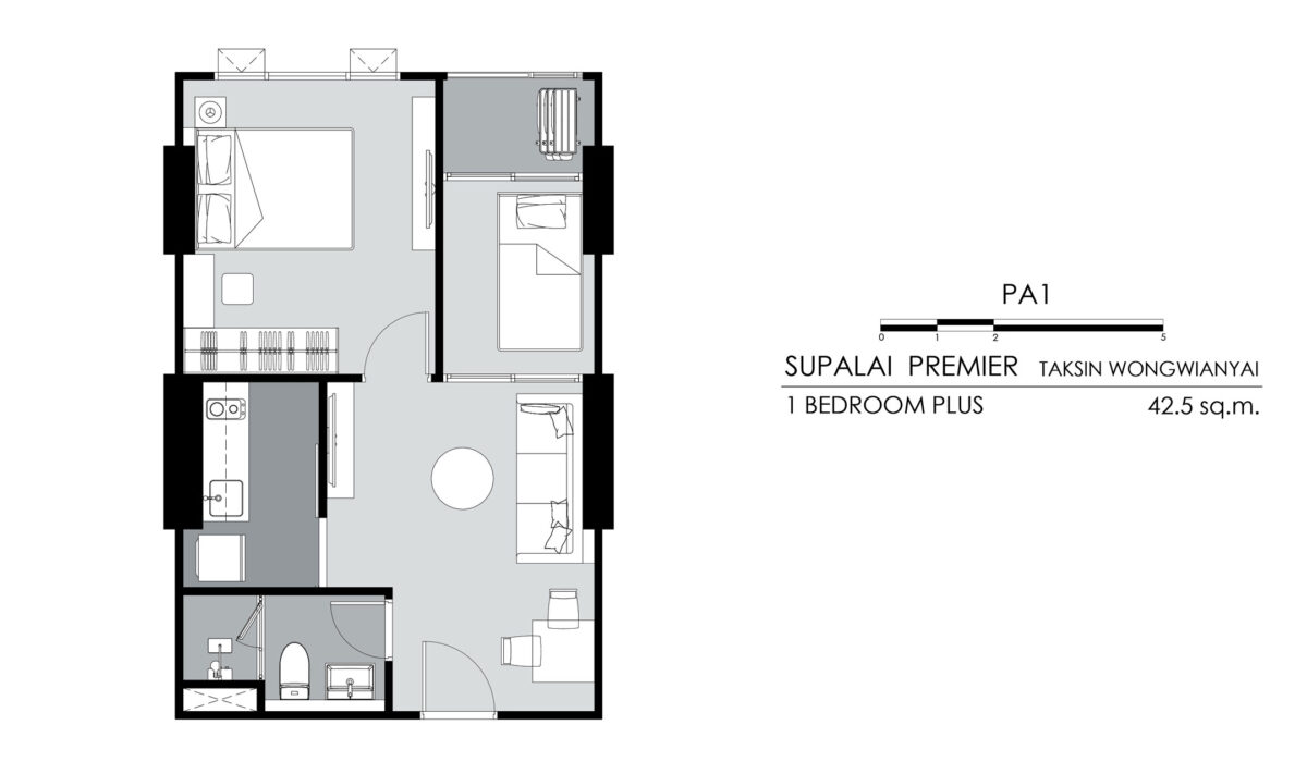 1 Bedroom Plus ขนาด 42.5 ตารางเมตร ห้องแบบ 1 ห้องนอน 1 ห้องน้ำ และ 1 ห้องอเนกประสงค์ แบบครัวปิด โดยห้องอเนกประสงค์มีระเบียงส่วนตัว สามารถปรับฟังก์ชันห้องได้ตามความต้องการ พื้นที่ห้องนอนและห้องนั่งเล่นกว้าง ตอบโจทย์การใช้ชีวิตได้หลากหลาย