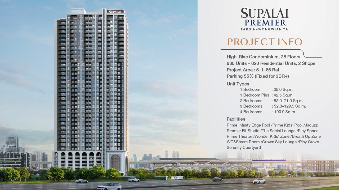 Supalai Premier Taksin – Wongwianyai (ศุภาลัย พรีเมียร์ ตากสิน – วงเวียนใหญ่) คอนโดมิเนียม High Rise ขนาด 38 ชั้น มีห้องพักอาศัย 828 ยูนิต และร้านค้า 2 ยูนิต ตั้งอยู่บนที่ดิน 5-1-85.7 ไร่ ที่จอดรถเฉลี่ย 55% มีห้องให้เลือกหลากหลาย ไม่ว่าจะเป็น ห้องแบบ 1 Bedroom ขนาด 35 ตารางเมตร, ห้องแบบ 1 Bedroom Plus ขนาด 42.5 ตารางเมตร, ห้องแบบ 2 Bedroom ขนาด 53-71 ตารางเมตร, ห้องแบบ 3 Bedroom ขนาด 92-129.5 ตารางเมตร และห้องแบบ 4 Bedroom ขนาด 190 ตารางเมตร ตอบโจทย์การอยู่อาศัยได้หลายรูปแบบ